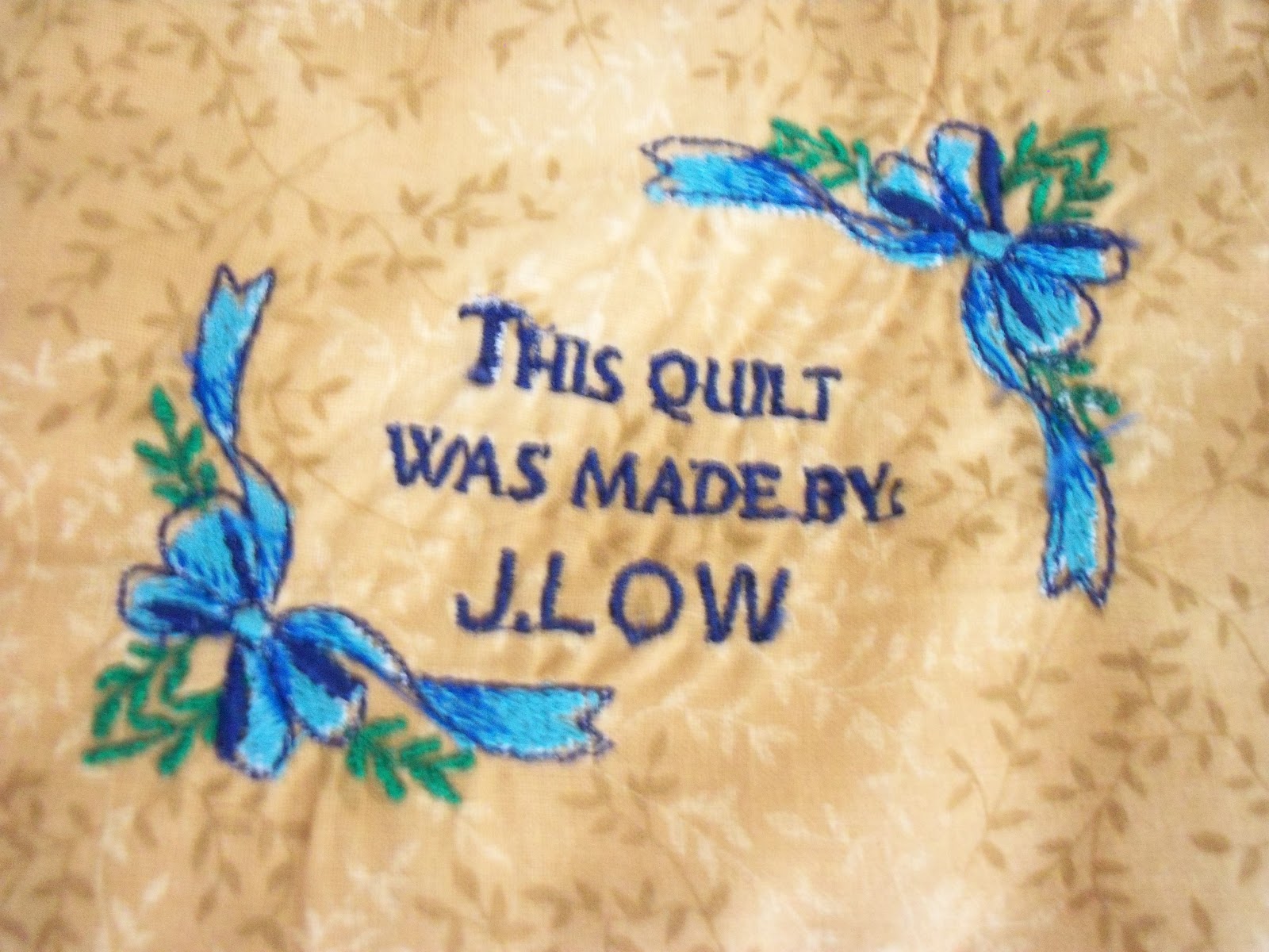 I made the quilt top from triangle scraps last fall, then I stripped the borders and have a queen sized quilt. All I need is pillow shams. I embroidered the laundry label and the quilt label. This is my first quilt on the longarm that is done with a pantograph , and the third quilt but first full sized one on my new Quilting Machine.
